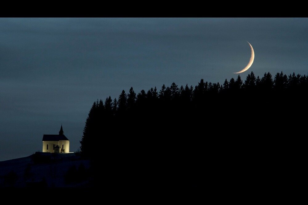 عکس روز ناسا هلال ماه را طوری نشان می‌دهد که گویی در حال بازی با یک کلیسای کوهستانی است.